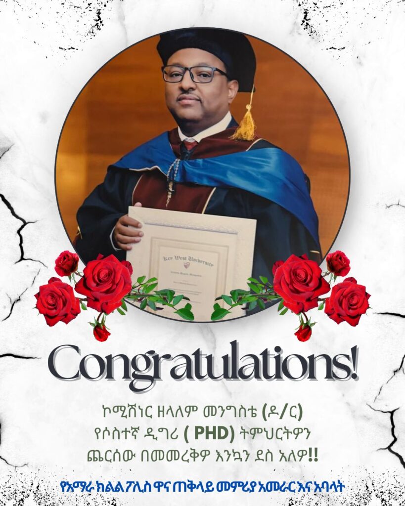 ኮሚሽነር ዘላለም መንግስቴ (ዶ/ር) የሶስተኛ ዲግሪ ( PhD) ትምህርትዎን ጨርሰው በመመረቅዎ እንኳን ደስ አለዎ!! የአማራ ክልል ፖሊስ ዋና ጠቅላይ መምሪያ አመራር እና አባላት