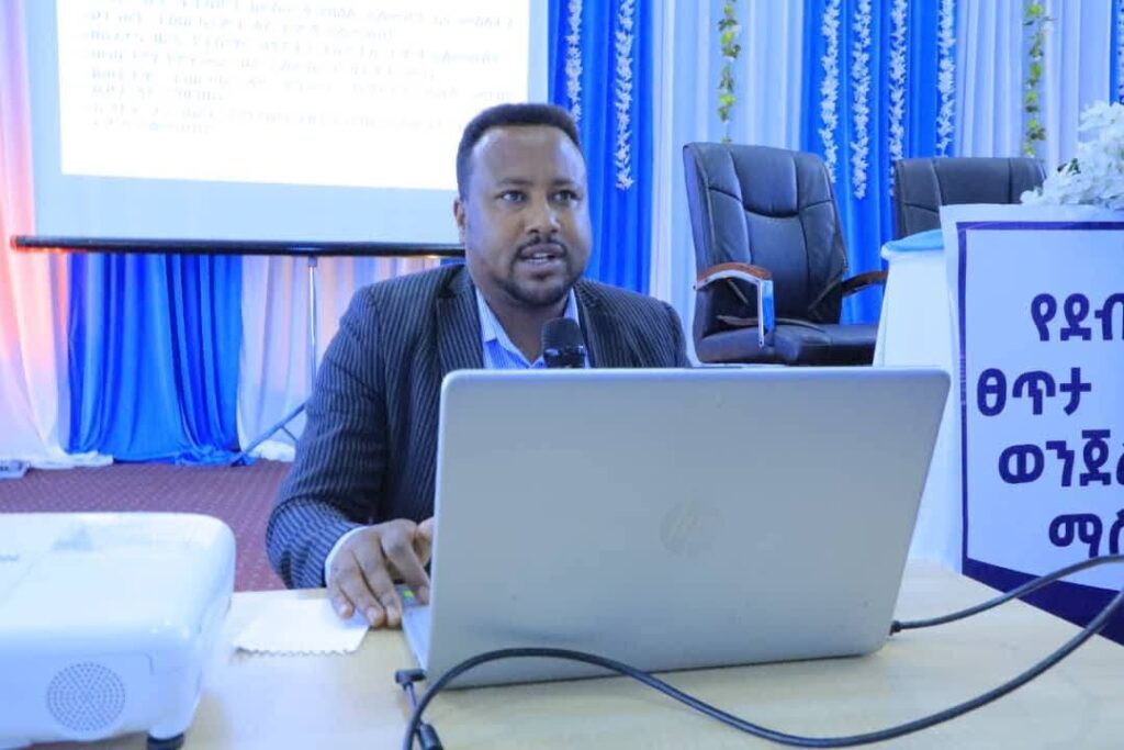 የደብረ ብርሃን ከተማ ሠላምና ፀጥታ መምሪያ ምክትል ኃላፊ አቶ መኳንንት አበበ ለውይይት መነሻ ዋና ዋና የአፈፃጸም ሪፖርት እያቀረቡ ነው።